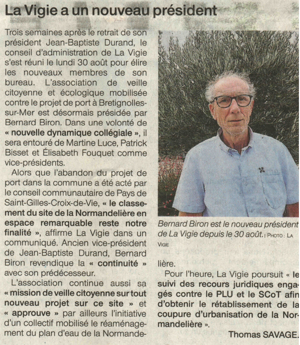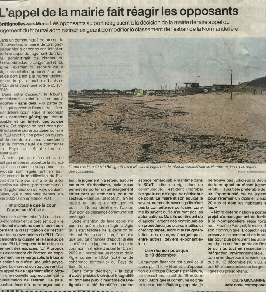 P.J. : communiqué de la mairie, communiqué en réponse de la Vigie, articles de presse du Journal des Sables du 17/11 et de Ouest France du 18/11.