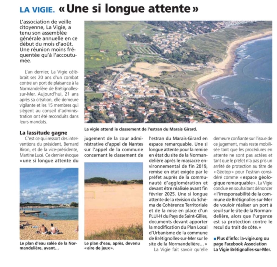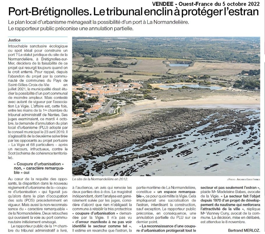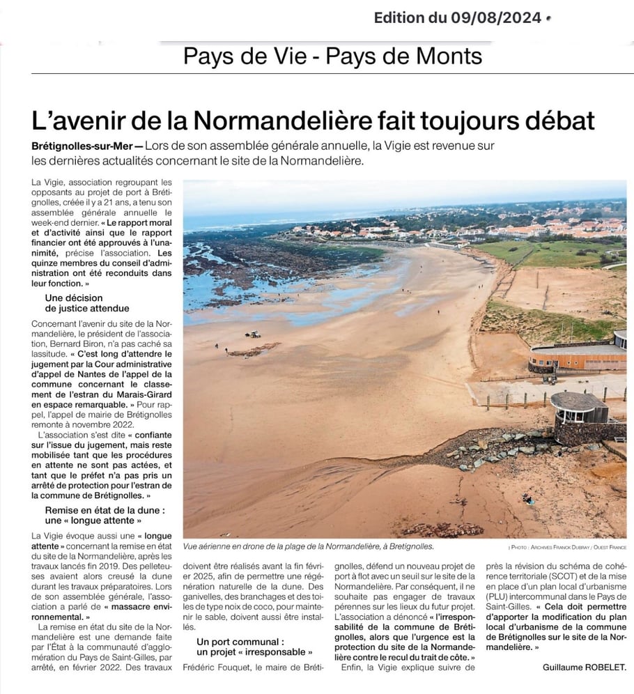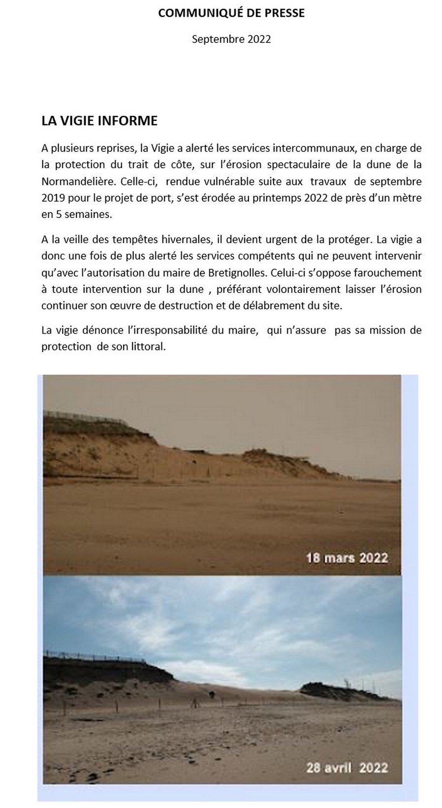 Nous sommes offusqués par l’obstination du maire à vouloir classer cet estran comme pouvant être aménageable pour la réalisation de son projet de port…Les précisions, vérifiables, apportées précédemment, prouvent juridiquement et administrativement l’infaisabilité d’un port à la Normandelière, comme la Vigie l’a toujours affirmé.