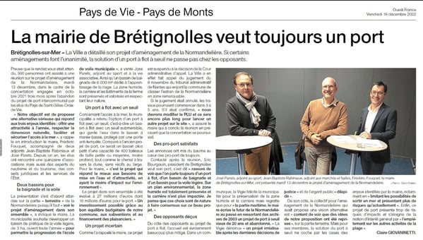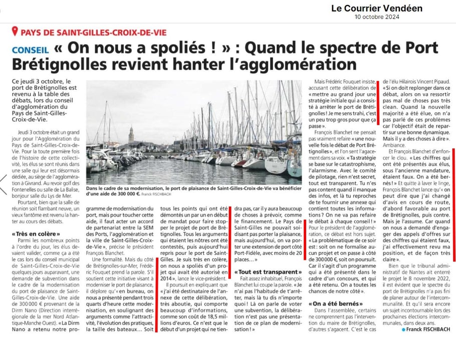 L'instigateur promoteur du projet de port à Bretignolles-sur-Mer est éliminé du pouvoir. Ce 10 juillet 2020 François BLANCHET est élu président de la Communauté de communes du Pays-de-Saint-Gilles-Croix-de-Vie et entend remettre en cause l'utilité du projet de port de plaisance.