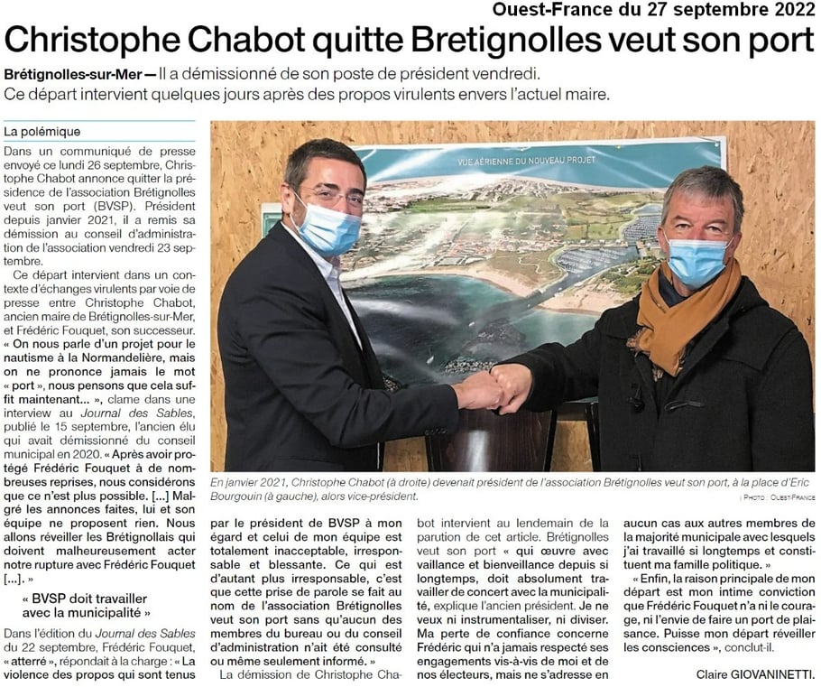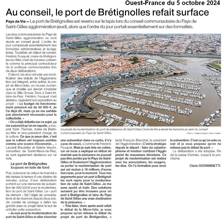 Ce 10 juillet 2020 le Conseil Communautaire du PSG (Pays-de-Saint-Gilles) élimine Christophe CHABOT, l'instigateur et promoteur autocrate du projet de port sur la commune de Bretignolles-sur-Mer, commune dont il n’est plus maire. Monsieur François BLANCHET, maire de Saint-Gilles-Croix-de-Vie, est élu président de la communauté de communes.