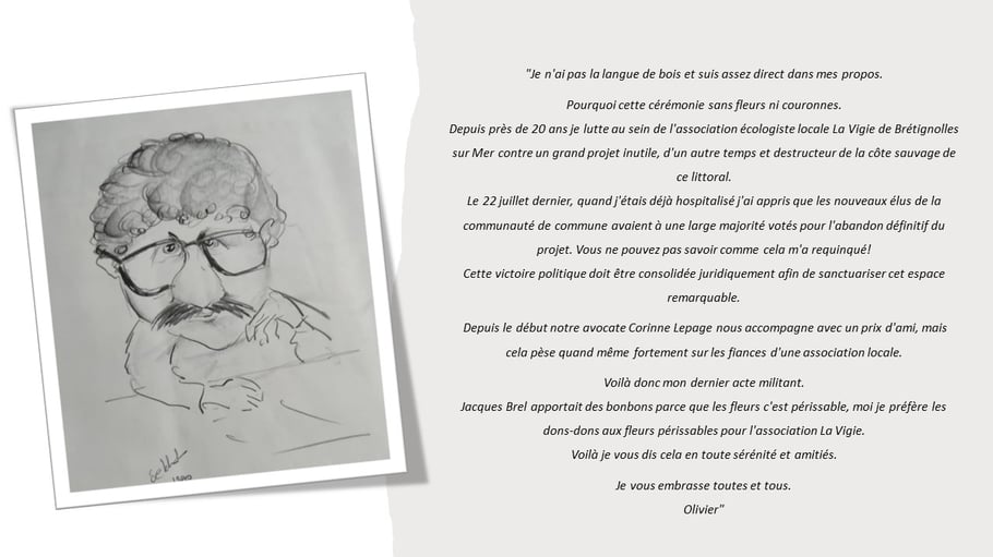 Ton intime conviction du devoir de veille contre les turpitudes des pouvoirs, portait ta fermeté dans ton engagement pour la défense de notre milieu rural littoral, et pour l'expression de ses valeurs traditionnelles qu'avec tendresse, tu as gravé de ta plume.